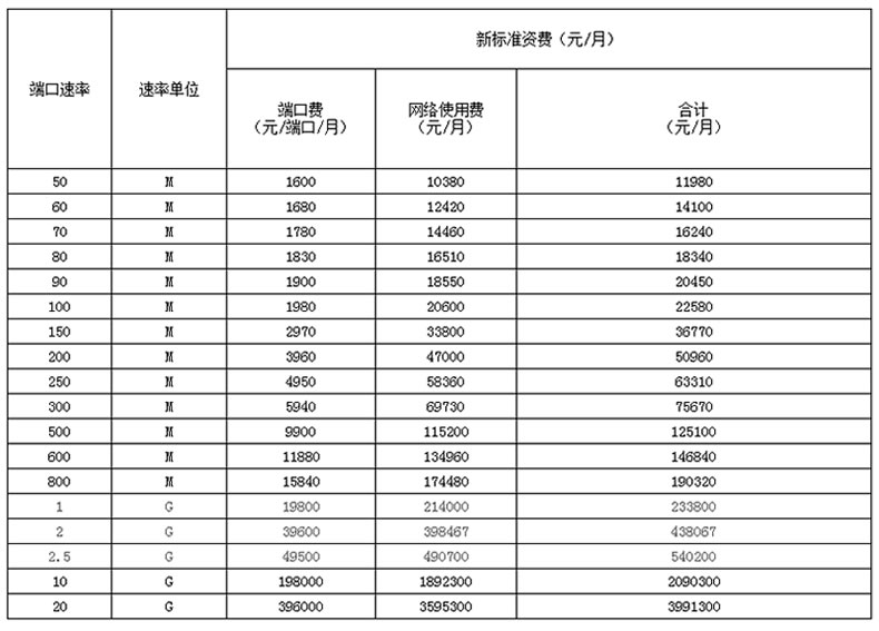 5、未列明速率的资费标准可按照以下公式计收:假设速率是X,低端口速率X1,资费F1,高端口速率X2,资费F2,则速率X的收费标准F=F1+(X-X1)(F2-F1)/(X2-X1)列表中粗体部分为文件下发标准端口速率及价格,其余为根据公式测算的价格。