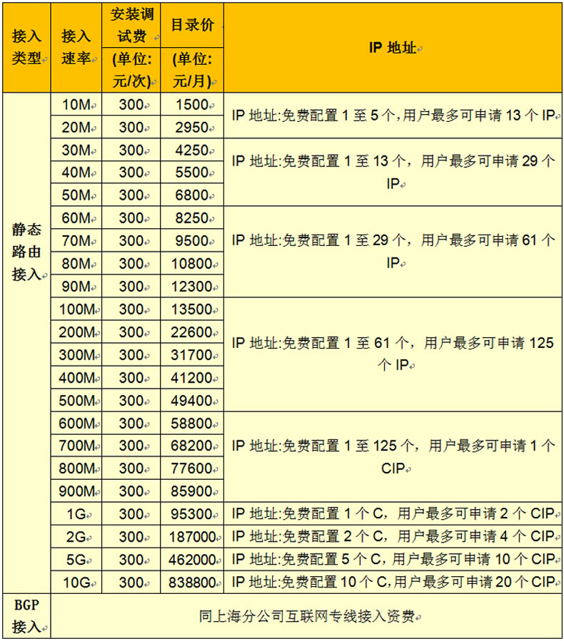 1、独享客户申请业务时,需注明自带设备类型(路由器或交换机)。如自带设备为路由器,免费赠送/30掩码的互联地址段,采用静态路由方式接