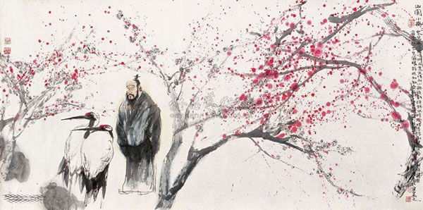 林逋是北宋诗人,他性情孤傲,隐居西湖,在孤山结庐而居,哪怕是皇帝赐官,也不为所动,二十年不入城市,是一个不折不扣的真隐士。他喜梅爱鹤,院里种白梅,庭前养仙鹤,以梅为妻,以鹤为子。闲暇时自驾一叶扁舟,到西湖岸边的寺庙里,与高僧们谈道论诗。如果家里来了客人,小童就把仙鹤放出来,林逋见到白鹤,就会划船归来,过着远离喧嚣的逍遥生活。他一生不曾娶妻,只钟爱梅花,把梅花当做妻子,所以他眼中的梅花,自有别样的风情。